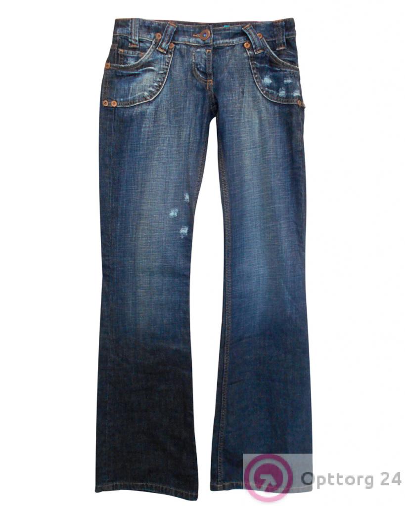 Джинсы с низкой посадкой. Декорированы контрастными клепками. Пять карманов, на поясе шлевки, застежка на молнию и пуговицу.