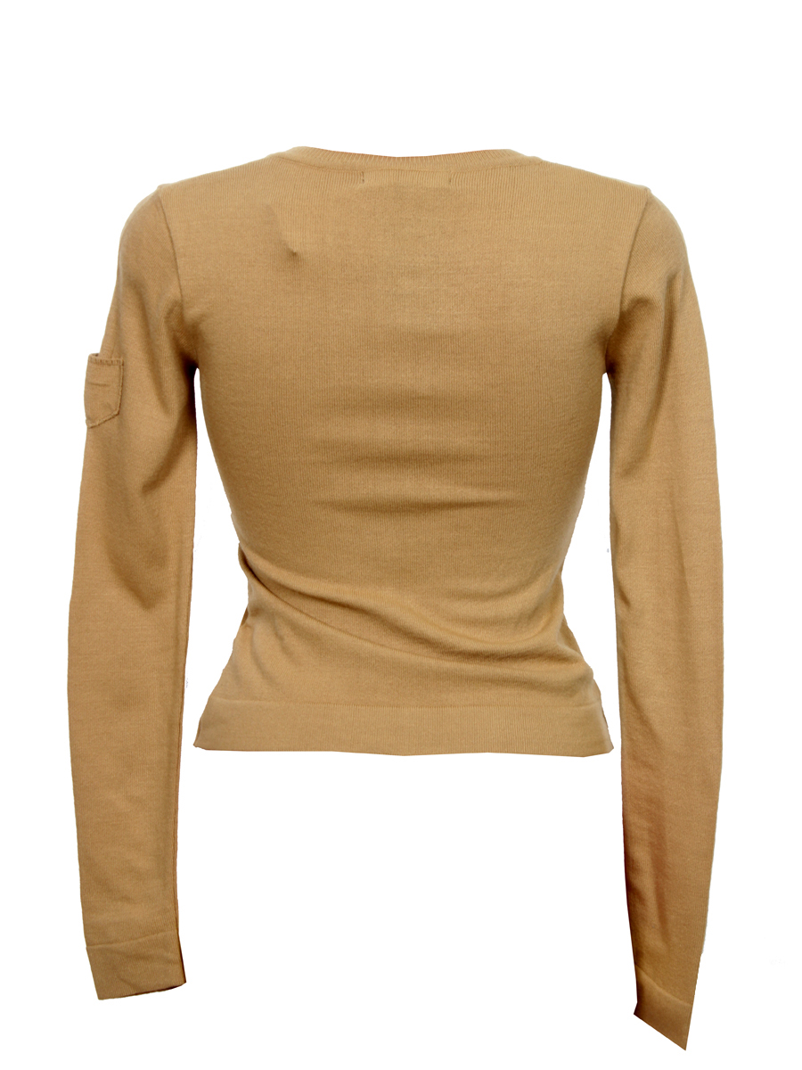 Женская кофта горчичного цвета. Есть накладной карман на рукаве. Стиль классический.