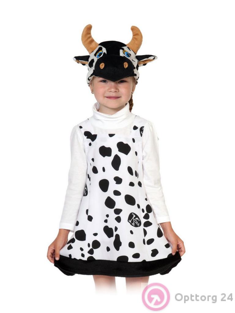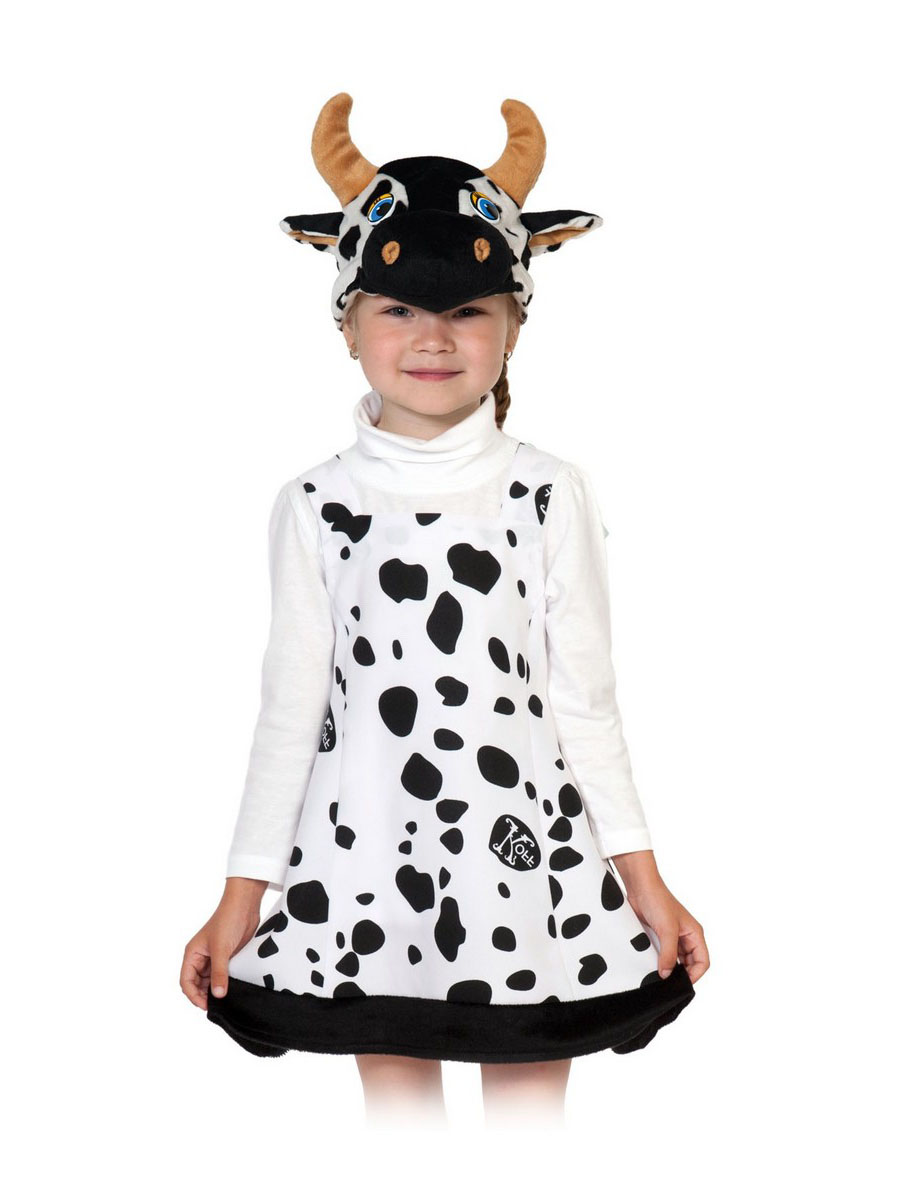 Комплект для девочек карнавальный Коровка. Состоит из белого в черное пятнышко сарафана и шапочки в виде головы коровы.