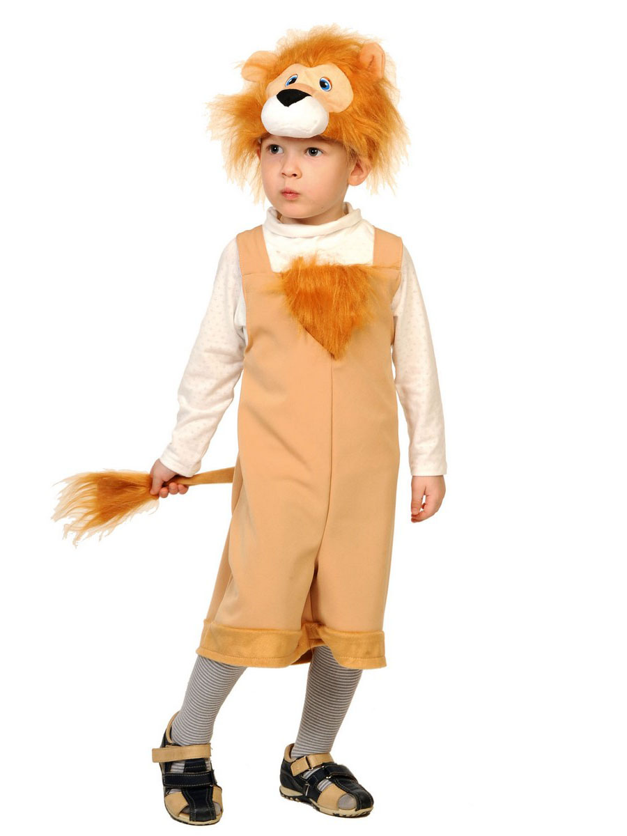Костюм праздничный для мальчиков дошкольного возраста Львенок, в комплекте которого есть коричневый комбинезон с хвостом и шапочка в виде головы льва.