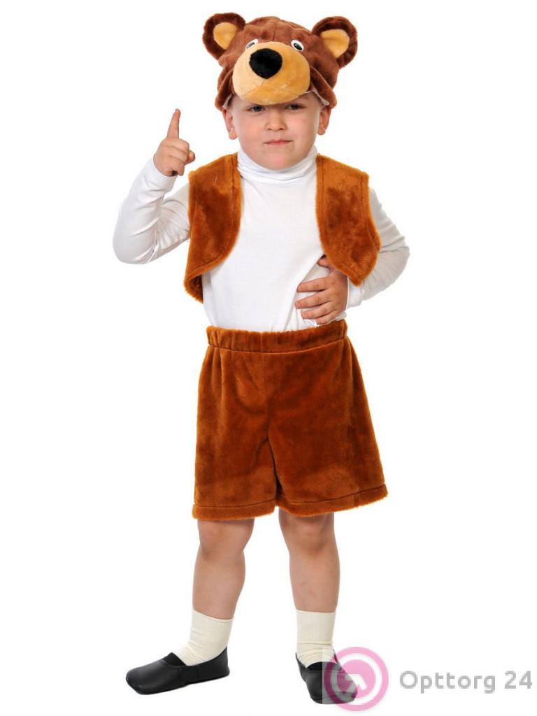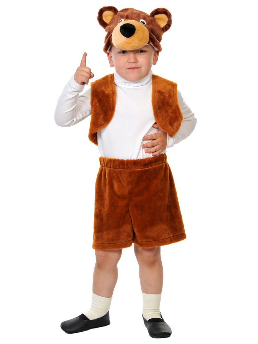 Костюм для детей праздничный Мишка бурый, состоящий из маски-шапки в виде головы медведя, коричневых шортиков и жилета.
