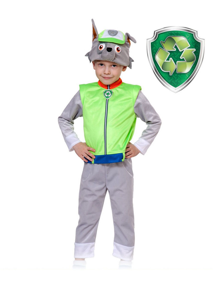 Костюм карнавальный для детей щенка Рокки из мультика Щенячий патруль. Состоит из серой маски-шапочки с мордочкой собаки в кепке, зеленой куртки-жилета с рукавами, серых бридж.