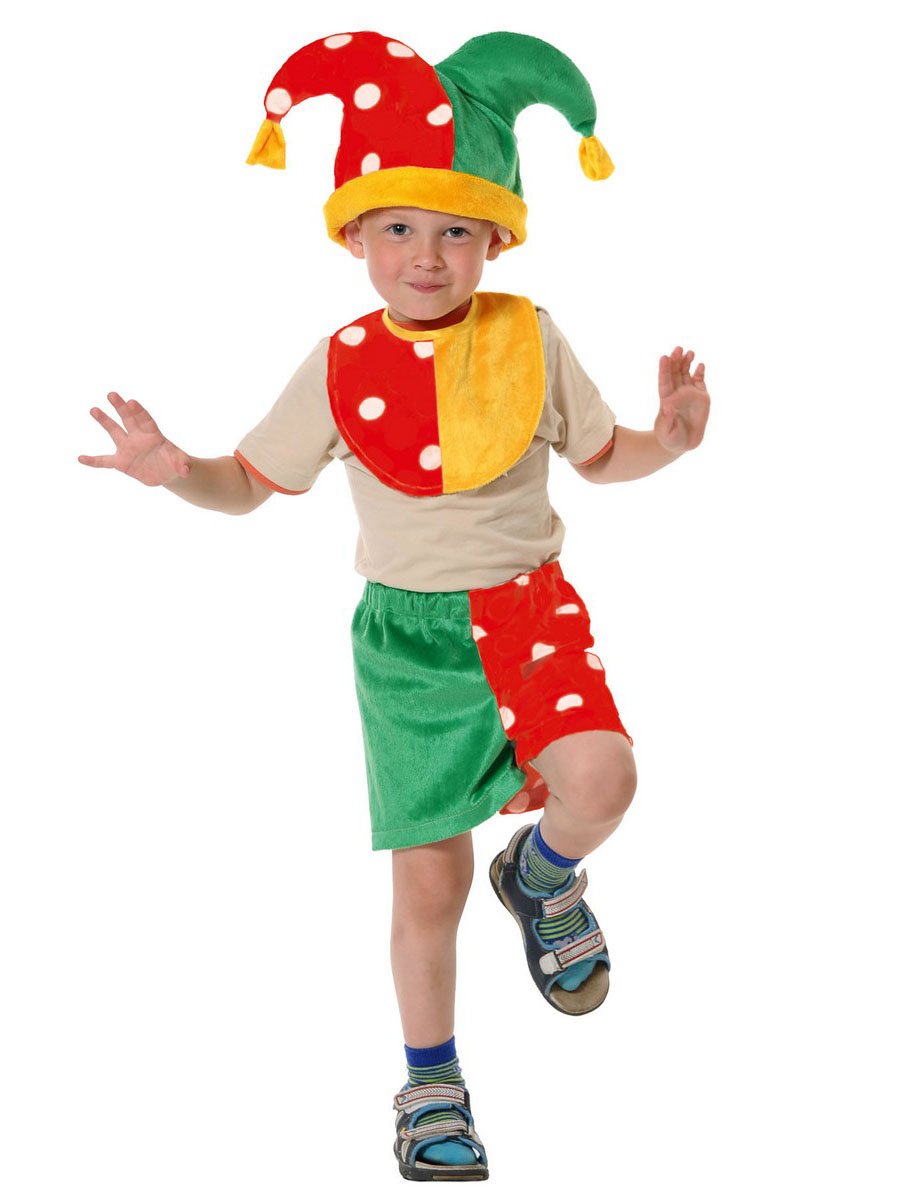 Детский костюм карнавальный Скоморох, состоящий из красно-зеленых шортиков, повязки на шею и необычной шапочки.