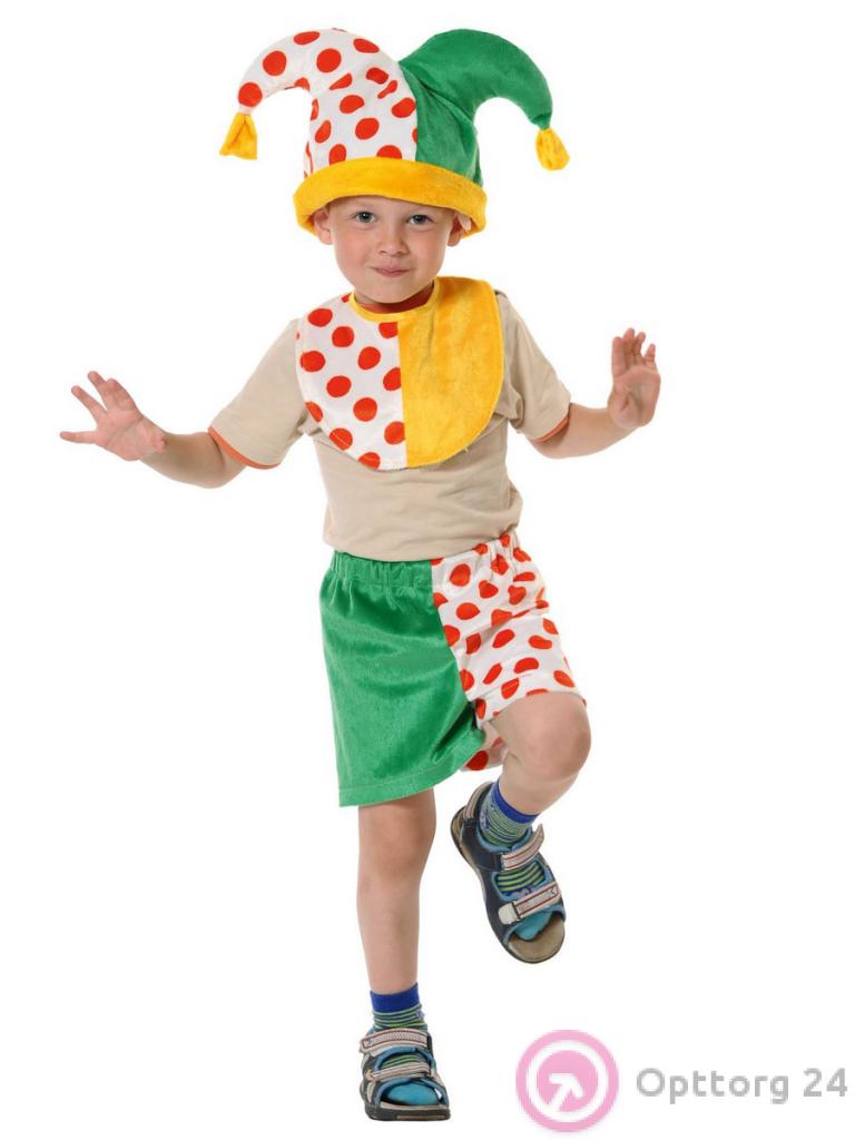 Костюм карнавальный для маленьких детей Скоморох, состоящий из красно-зеленых шортиков, манишки и необычной шапочки.
