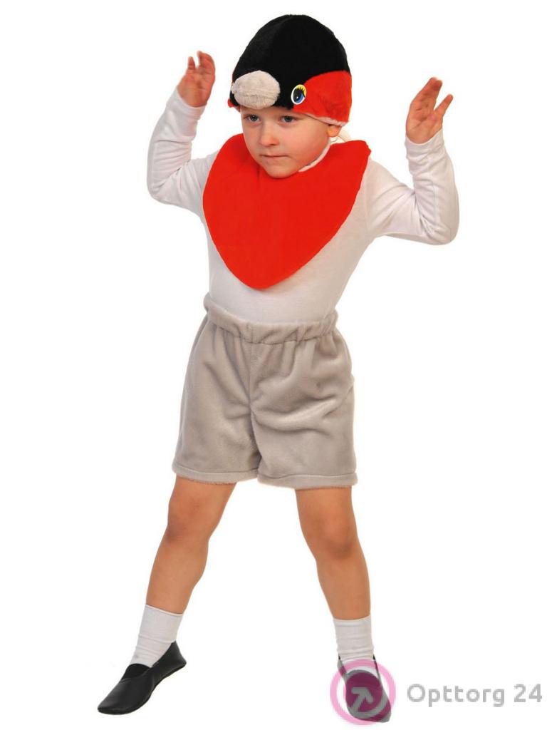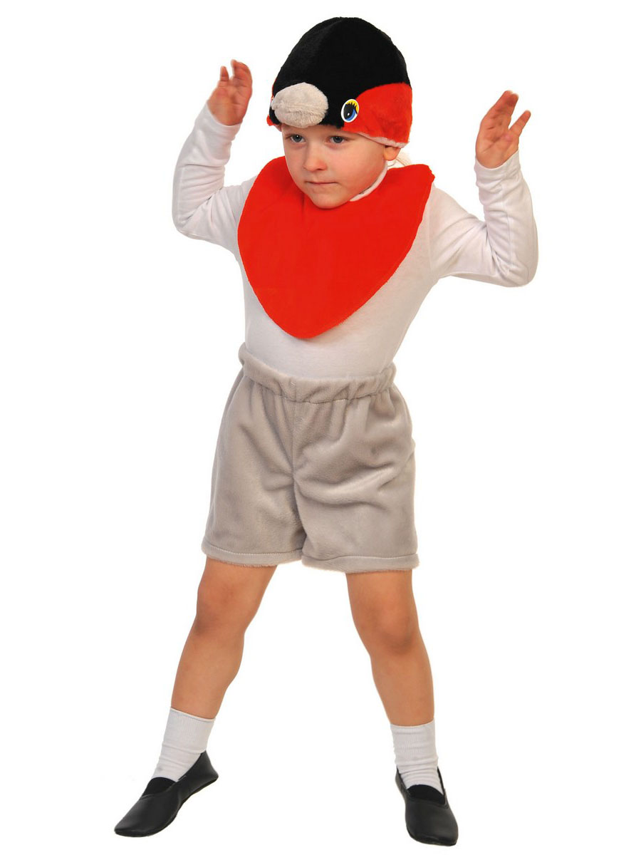Карнавальный детский комплект для утренника Снегирь, который состоит из красной манишки, серых шортиков и шапочки в виде головы птицы.