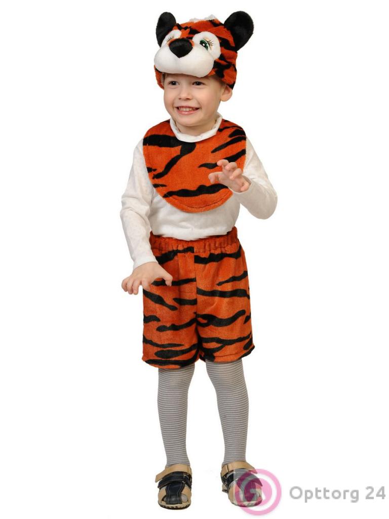 Детский костюм для детских праздников Тигренок. Состоит из пятнистых шортиков и манишки, на голове - шапочка в виде мордочки тигра.