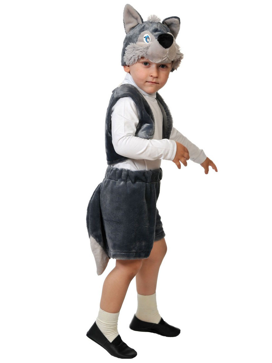 Детский костюм для детей Волчонок. Состоит из серых шортиков с хвостом, жилетки и маски-шапочки в виде головы волка.
