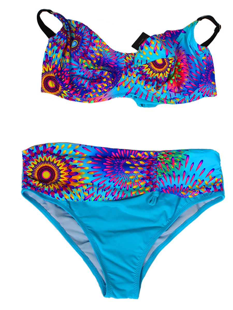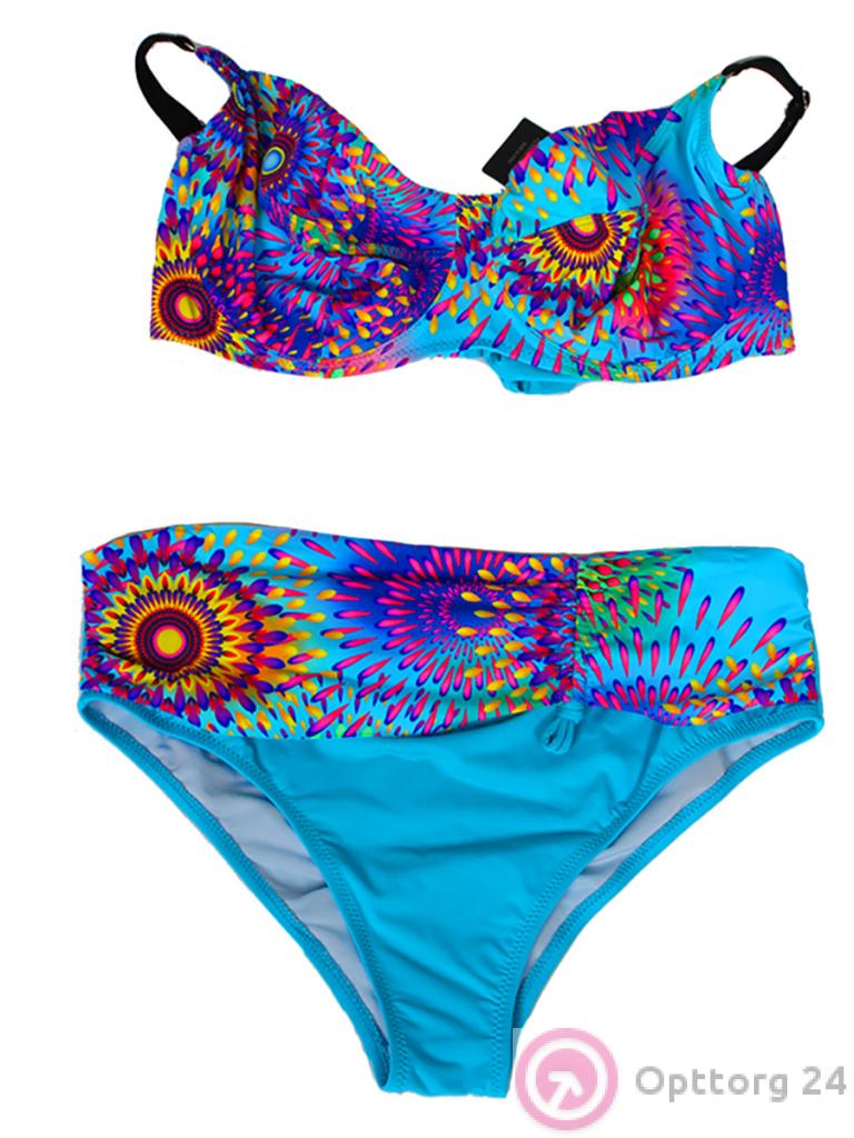Женский купальник для пляжного отдыха. Цвет синий с яркими вставками. Лиф на косточке, низ прямой.