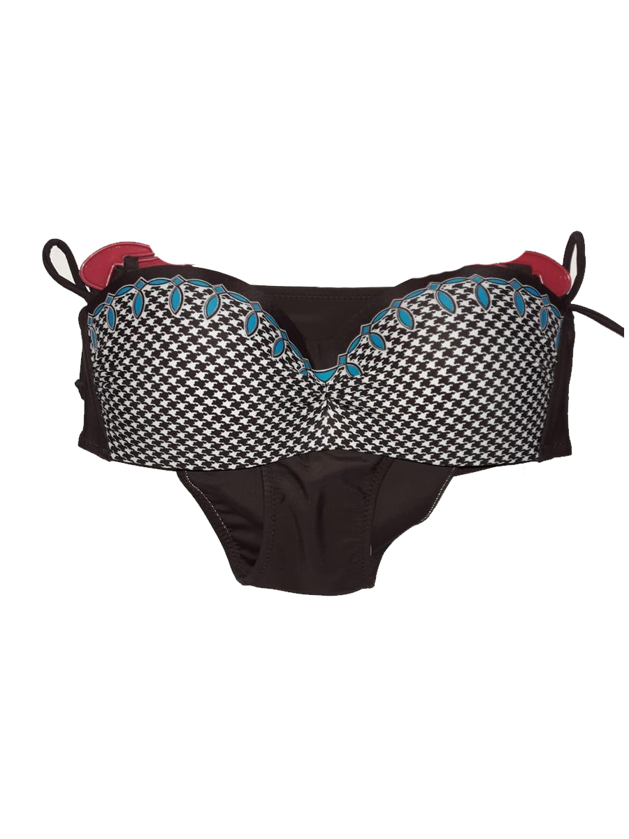 Купальник женский. Стиль современный. На завязках с чашками черный с синими и белыми узорами