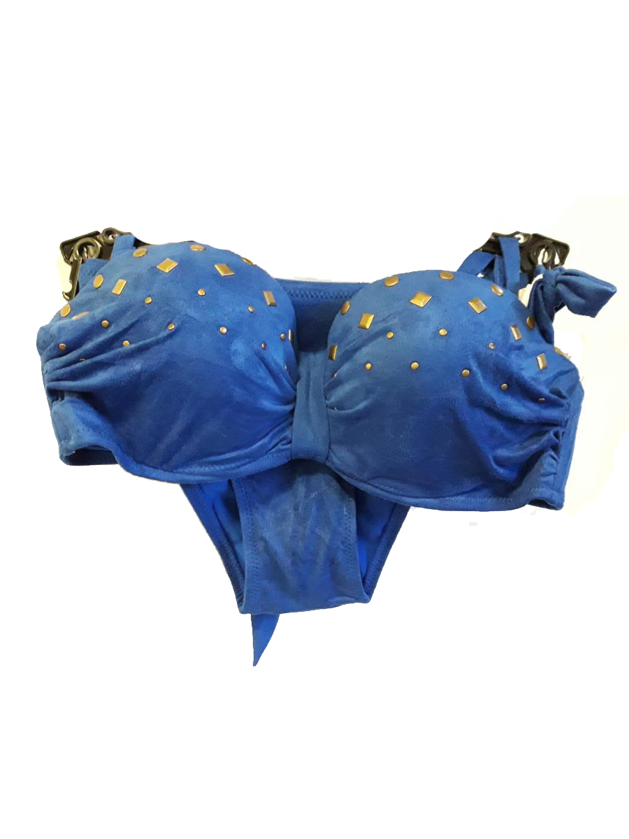 Купальник женский. Стиль современный. На завязках с чашками синий с золотыми вставками. Под бархат.