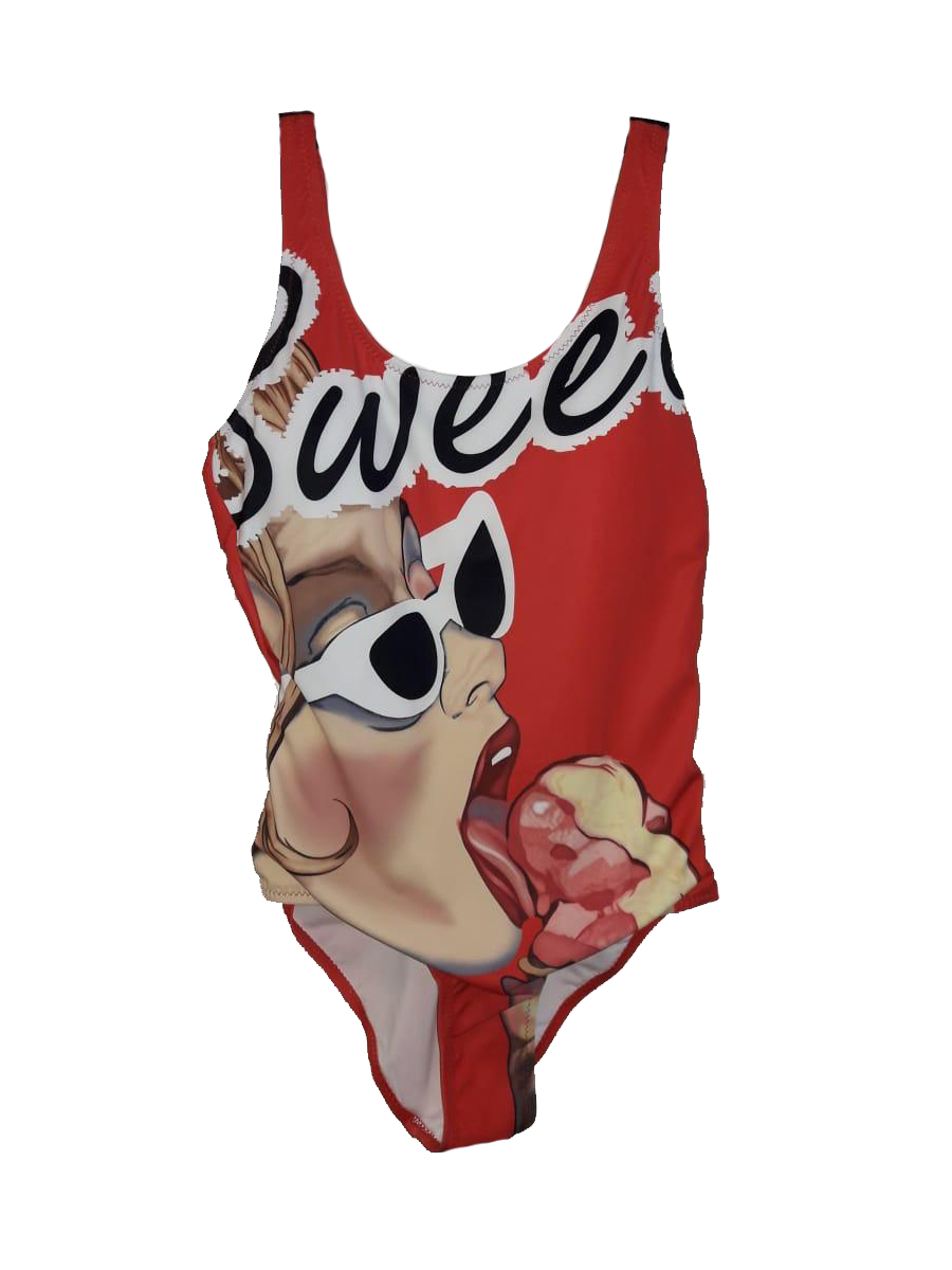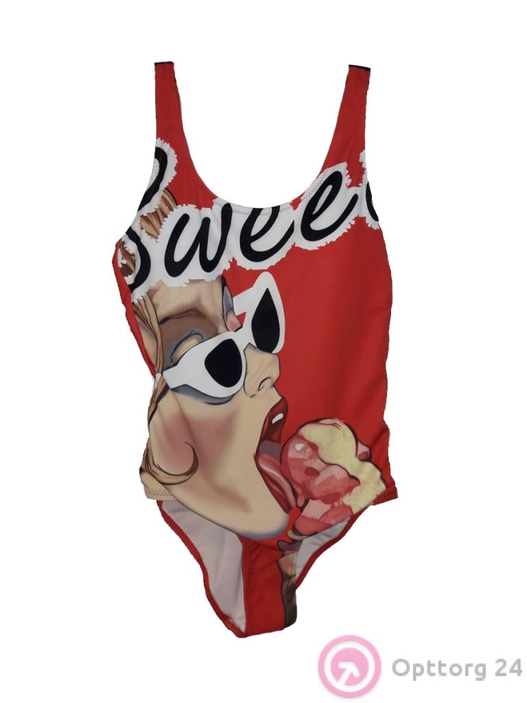 Купальник женский современного кроя. Слитный с принтом девушки в очках.