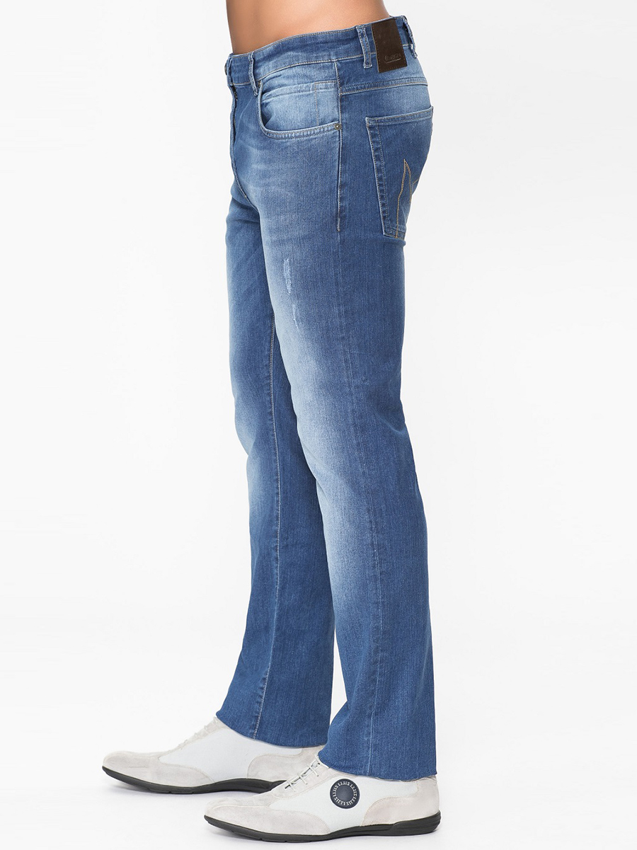 Мужские джинсы синего цвета с дырками и протертостями. Стиль современный.