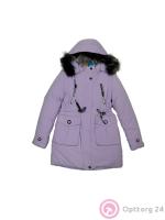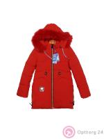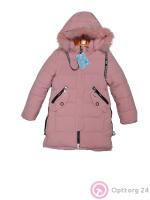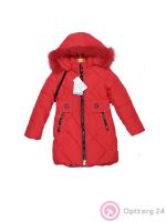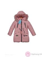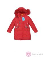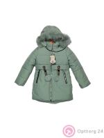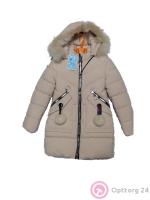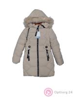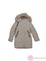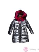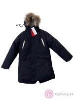 Женский пуховик темно-синего цвета с мехом на воротнике