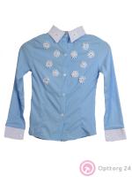 Блузка для девочки школьная голубого цвета с воротом и нашивкой из цветов