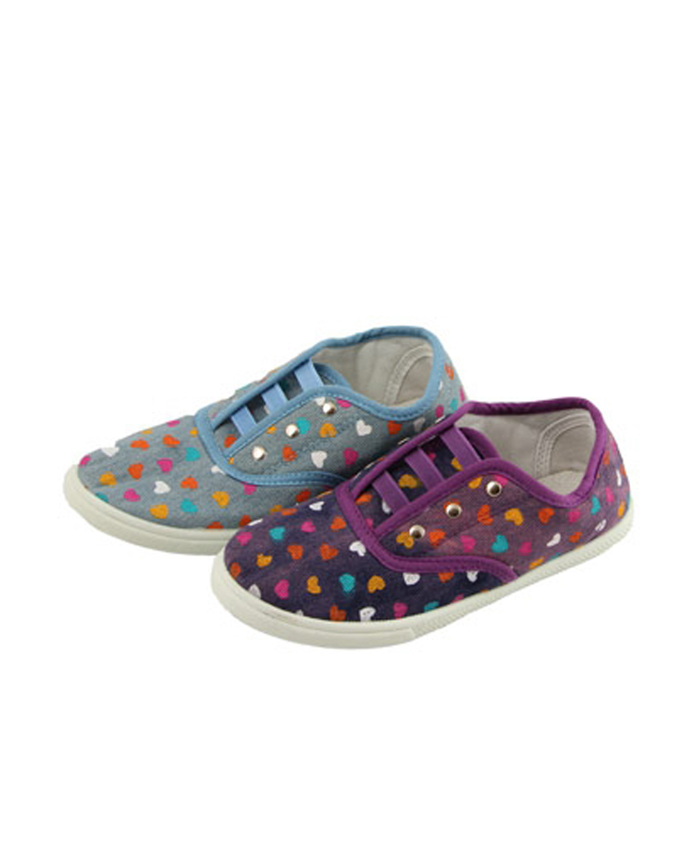 Кеды для девочек из качественного текстиля с принтом в виде разноцветных середечек. Прекрасная обувь для теплого время года. Подошва кед очень гибкая, но в то же время прочная, износостойкая. Фиксатор сделан в виде 3-х резинок, что обеспечивает максимальный комфорт при носке. Данная модель представлена в двух рассцветках: фиолетовые и голубые.