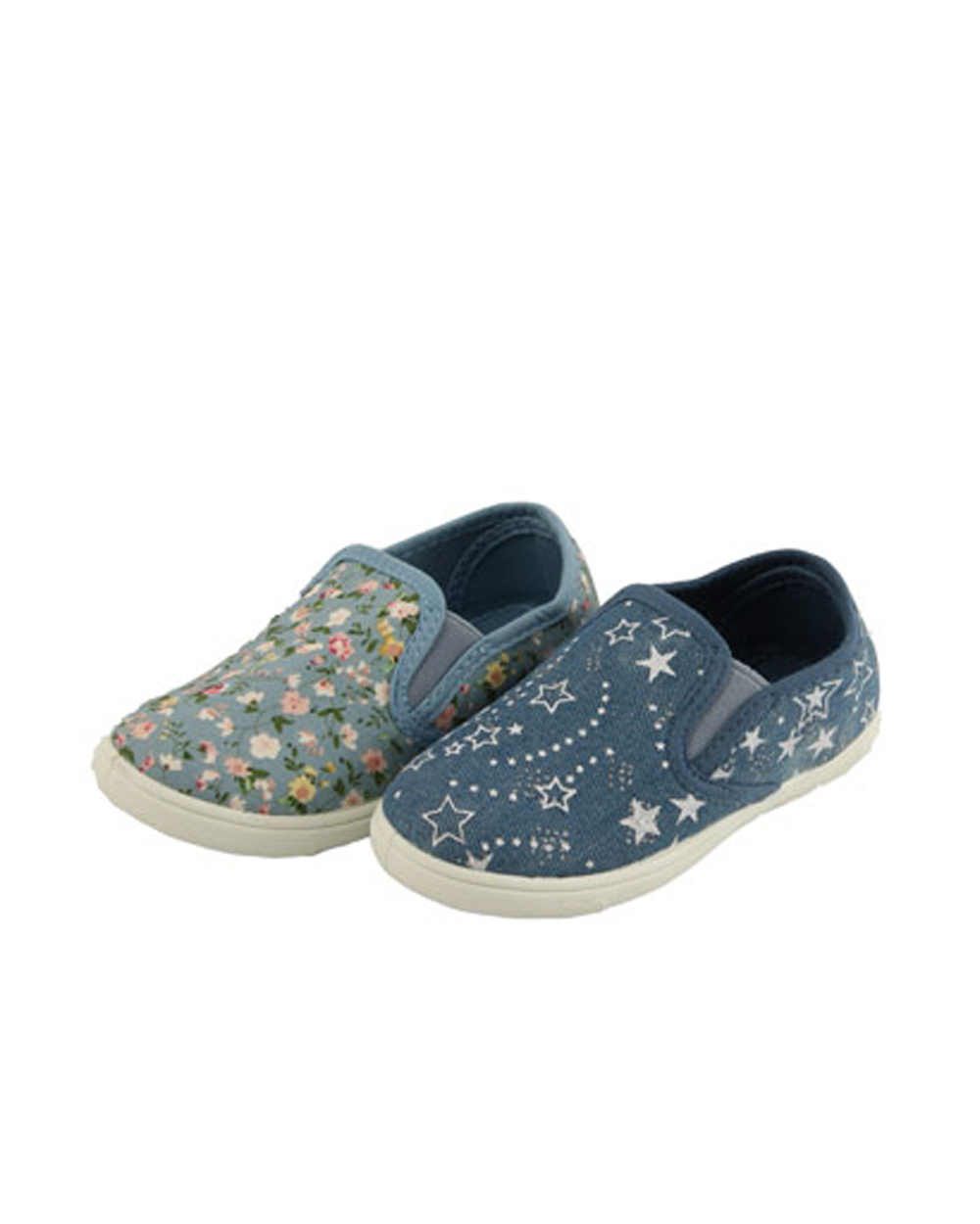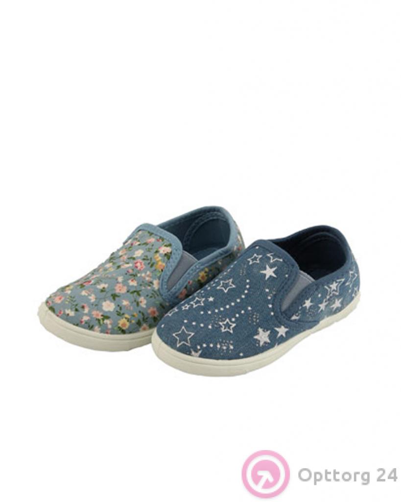 Удобные кеды для деток, выполнены из качественного текстиля. Подошва резиновая, гибкая и легкая. По боках вставлены резинки. В коробке кеды двух расцветок: голубые с цветочным принтом и синие со звездочками.