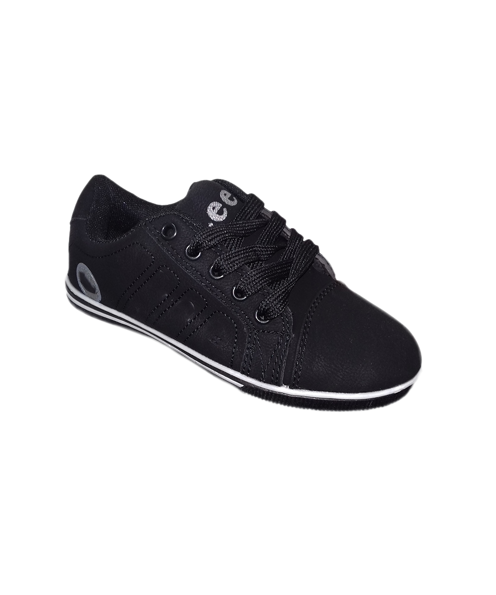 Детские кроссовки черного цвета с контрастной белой подошвой. Объем по ноге регулируется с помощью шнуровки.