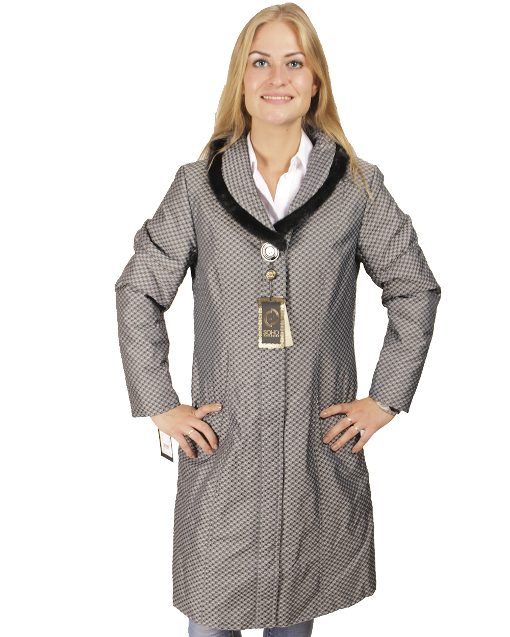 Элегантное женское пальто, серого цвета, раскрас "гусиные лапки" Длинный воротник не даст замерзнуть в самый знойный ветер. А пушок на краю воротника подарит эксклюзивную привлекательность.
