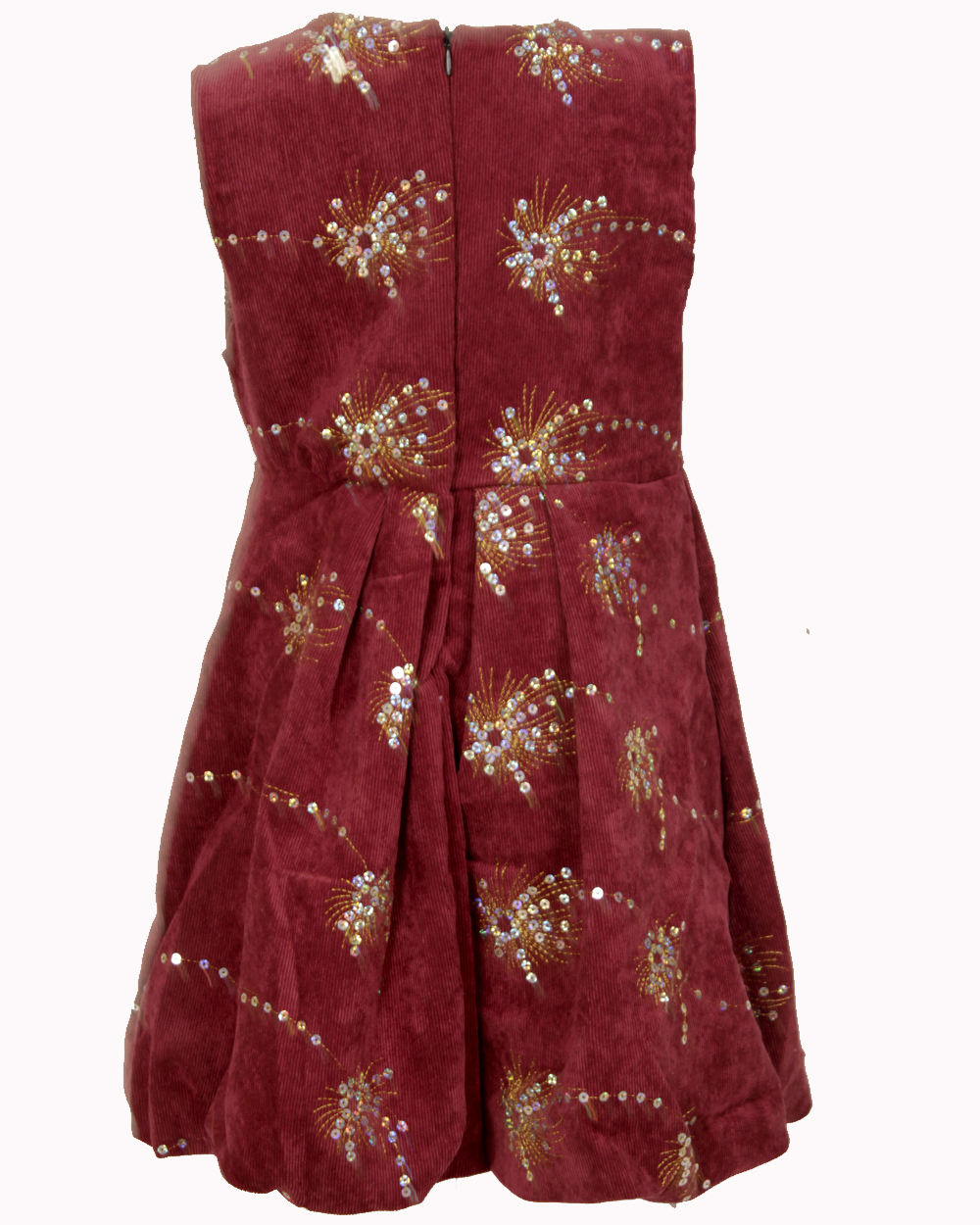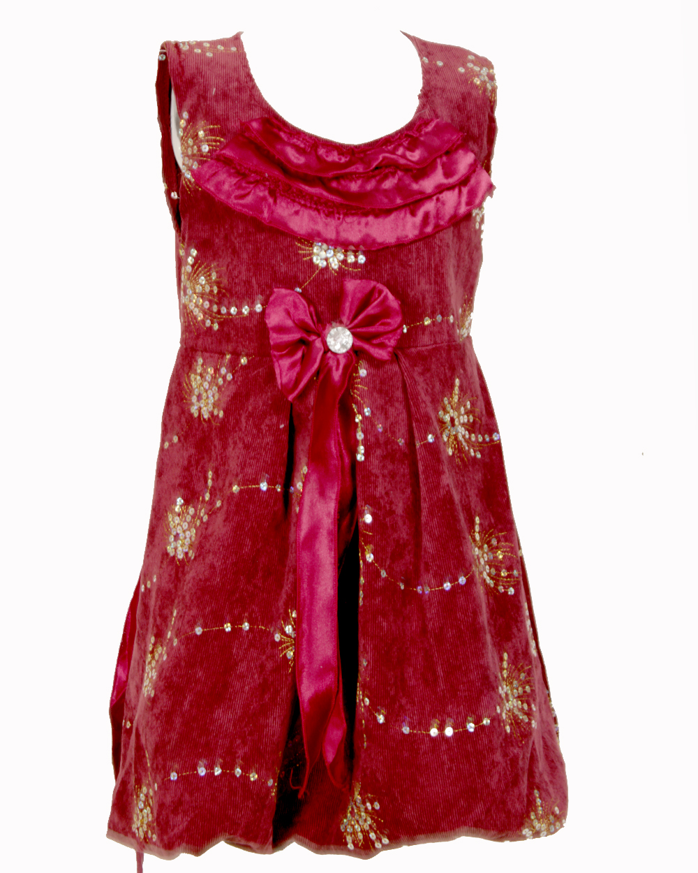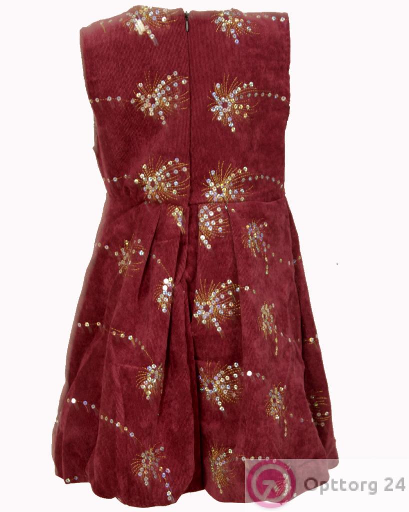 Детское платье красного цвета с бантом на талии и блестками по всей поверхности изделия.