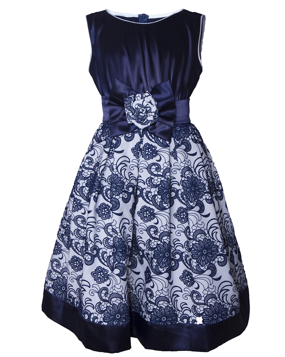Стильное детское платье "Елена" тёмно-синего цвета. Нижняя часть платья украшена контрастными цветами в тон платья. На талии расположена широкая лента с элегантным бантом.