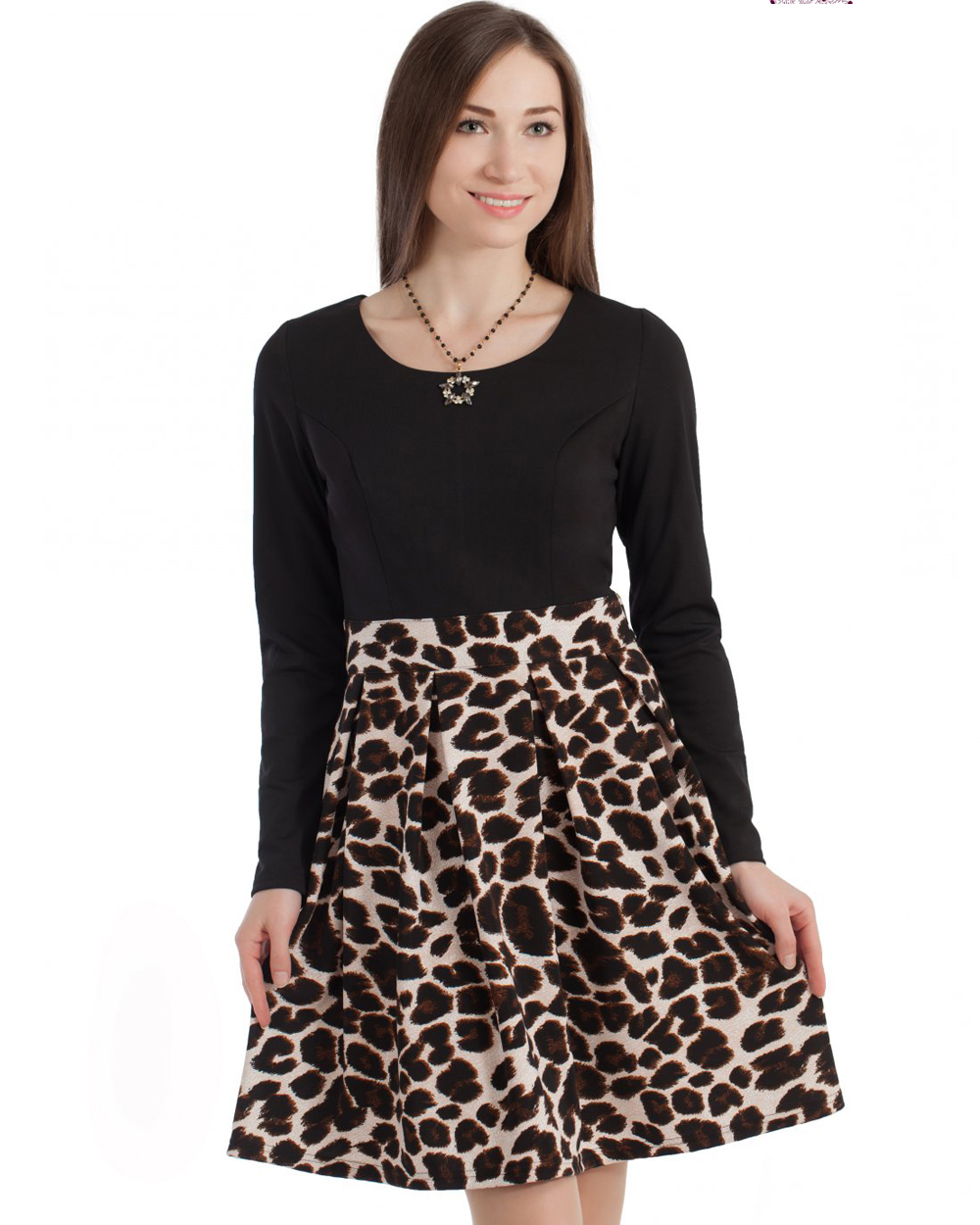 Эффектное платье с леопардовым принтом внизу и строгим чёрным верхом. Модель отлично подойдет как для каждодневной носки, так и для выхода в свет.