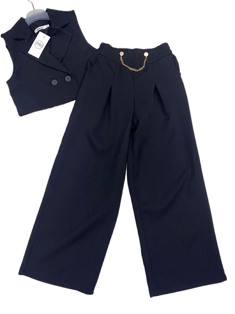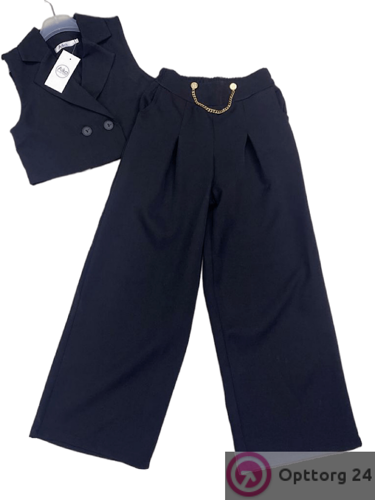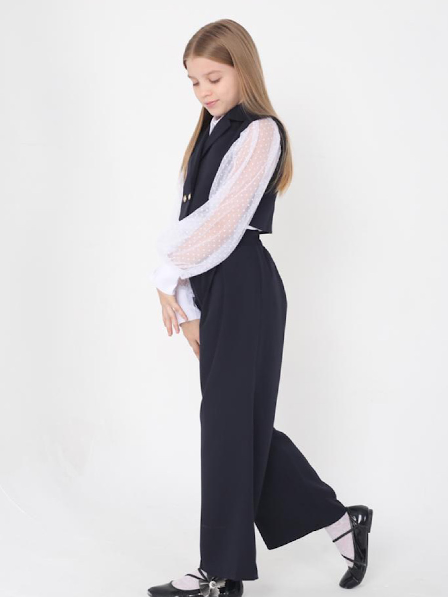 Костюм школьный для девочки. Состоит из жилетки и брюк. Жилет двубортный, укороченый, на пуговицах. Брюки широкого кроя на резинке, украшены цепочкой.