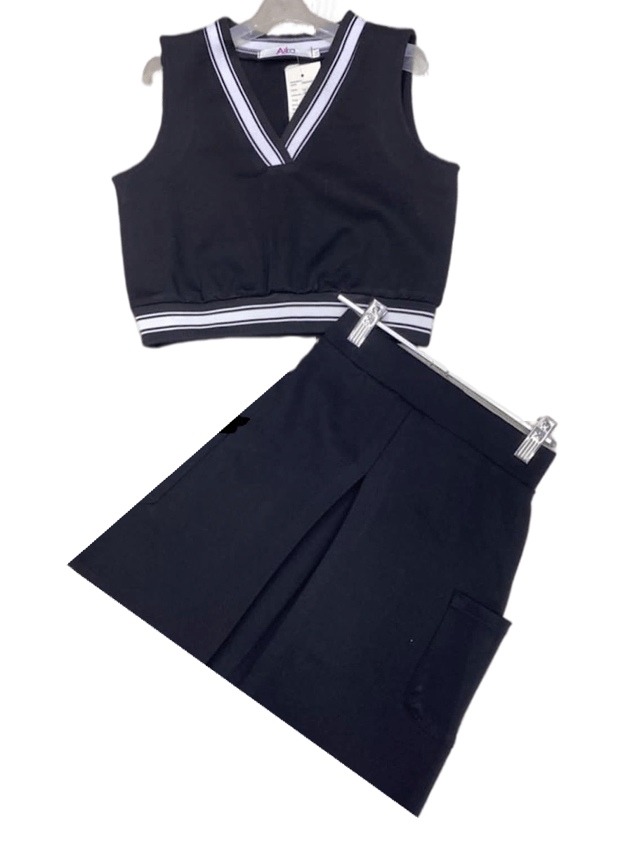 Костюм школьный для девочки. Состоит из жилетки и юбки. Жилет с v-образным вырезом без пуговиц, отделан на воротнике и по низу окантовкой. Юбка расклешенная с карманами по бокам. Стиль спорт-шик.