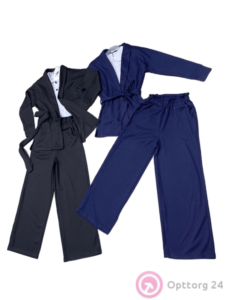 Костюм школьный для девочки. Состоит из жакета и брюк. Жакет на поясе, отложной воротник. Брюки широкого кроя на резинке.