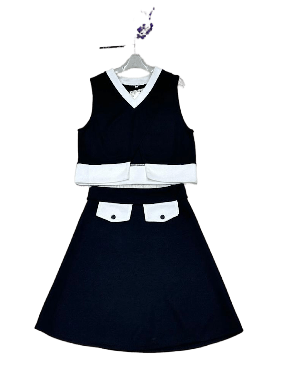 Костюм школьный для девочки. Состоит из жилетки и юбки. Жилет с v-образным вырезом без пуговиц, отделан на воротнике и по низу окантовкой. Юбка расклешенная с имитацией карманов. Стиль спорт-шик.