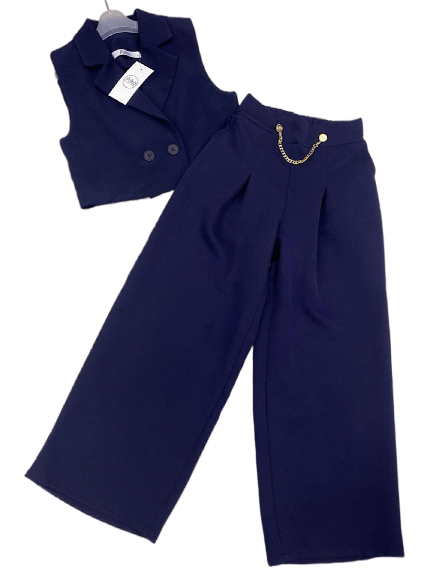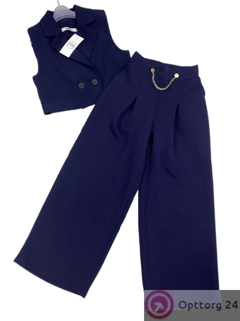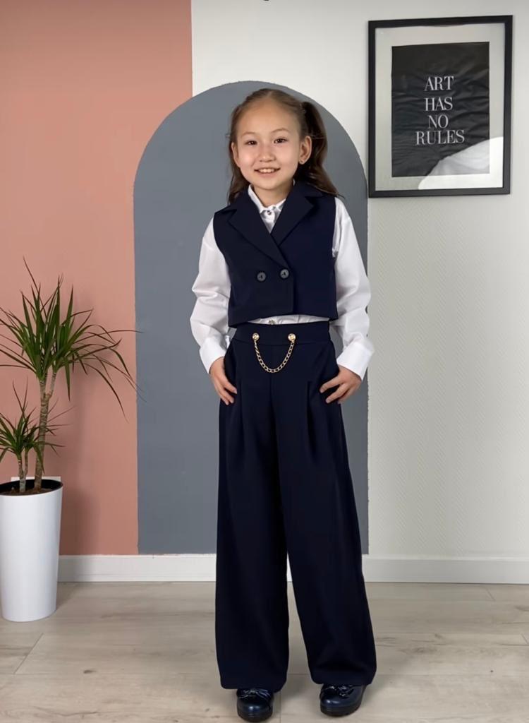 Костюм школьный для девочки. Состоит из жилетки и брюк. Жилет двубортный, укороченый, на пуговицах. Брюки широкого кроя на резинке, украшены цепочкой.