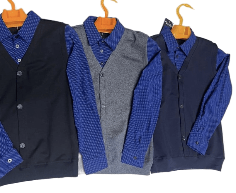 Рубашка с жилетом для мальчика ( имитация). Рубашка с отложным воротником, жилетка с v-образным вырезом, с пуговицами и резинкой по краю. Рубашка с манжетами на пуговицах.