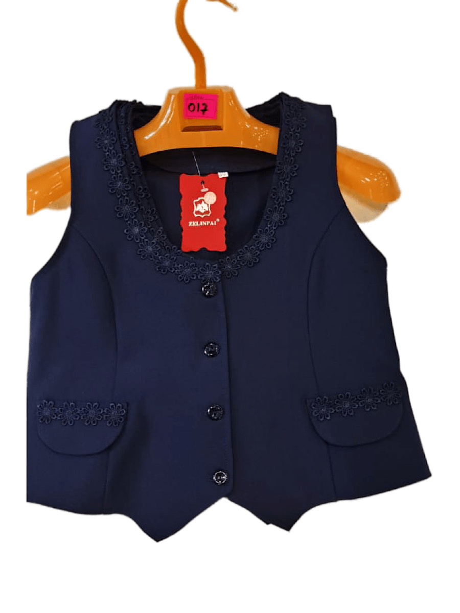 Жилетка для девочки школьная, украшена кружевом на воротнике. Имитация карманов по бокам, отделаны кружевом. На пуговицах, приталенная.