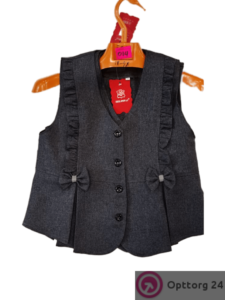 Жилетка для девочки, школьная. Украшена бантиками по бокам. Вдоль воротниковой зоны оборки. На пуговицах, приталенная.
