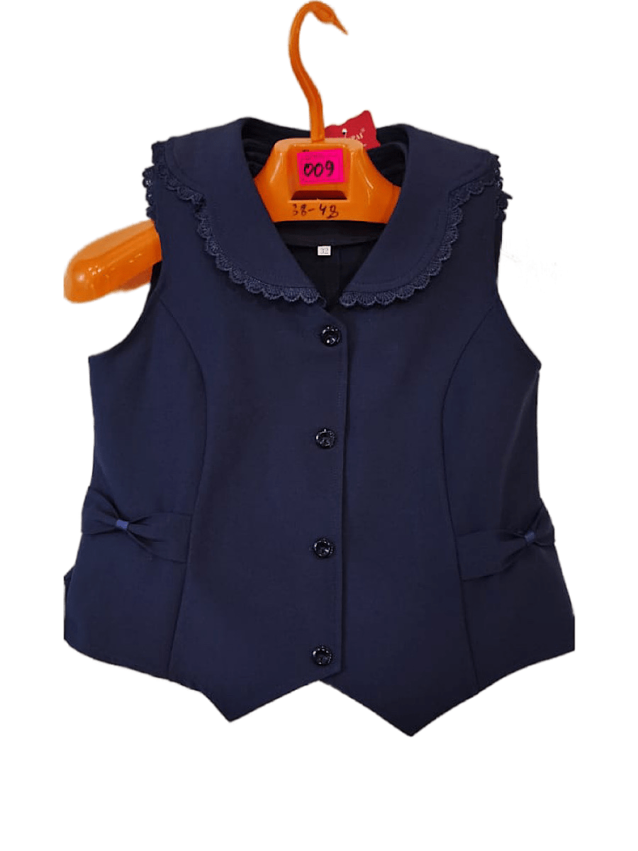 Жилетка для девочки школьная, украшена кружевом на воротнике. Имитация карманов в виде бантов. На пуговицах, приталенная.