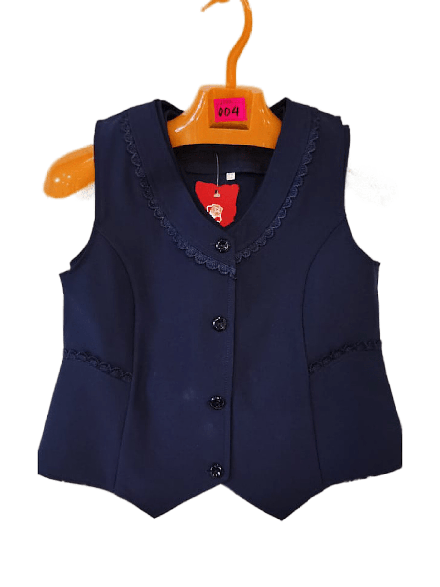 Жилетка для девочки школьная, украшена кружевом на воротнике. На пуговицах, приталенная.