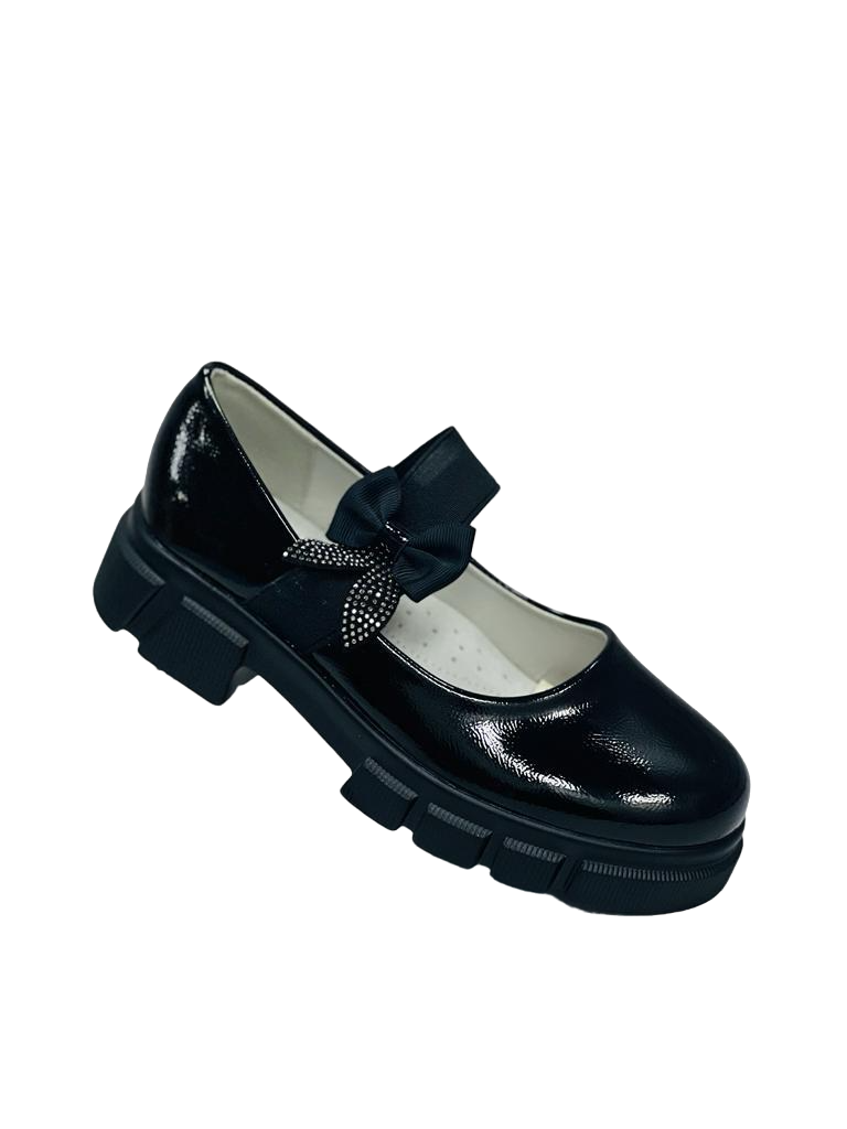 Стильные детские туфли для девочки. Отличное дополнение к школьной форме и не менее удобное использование для повседневной носки. Надежная фиксация на ноге за счет ремешка - липучки , дополненного элегантным бантом.