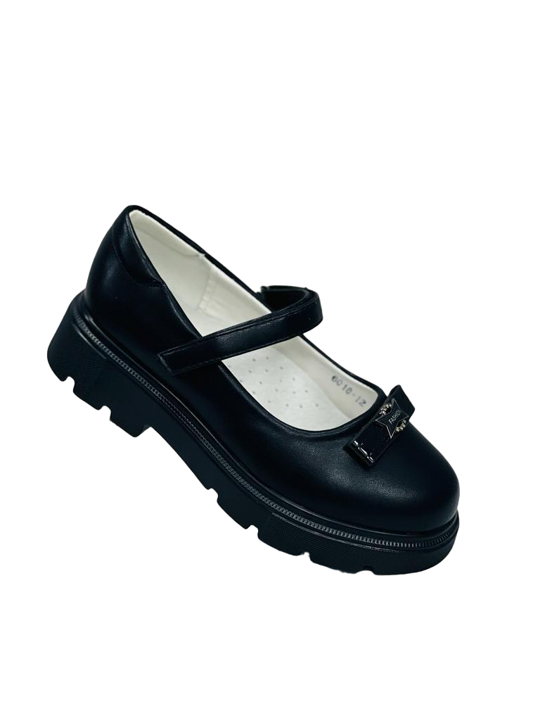 Школьные туфли для девочки с ремешком на липучке. Моделька представлена в черном цвете. Износостойкая подошва даст комфорт при ношении. Липучка ускорит и облегчит процесс обувания.