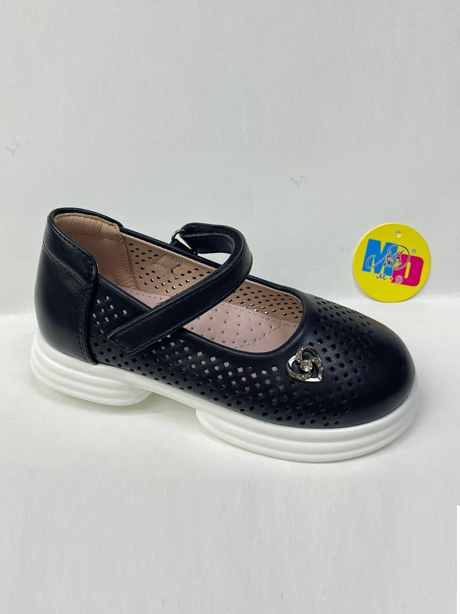 Туфли школьные для девочки черные дышащие, с декоративным элементом из страз в форме сердечка, застегиваются ремешком, со стильной белой подошвой, придающий туфлям яркий дизайн.