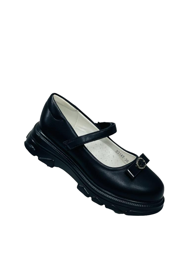 Комфортные туфли для девочки. Отличное дополнение школьной формы и оптимальный выбор для повседневной носки. Удобная подошва и надежная фиксация на ноге. Модель представлена в черном цвете.