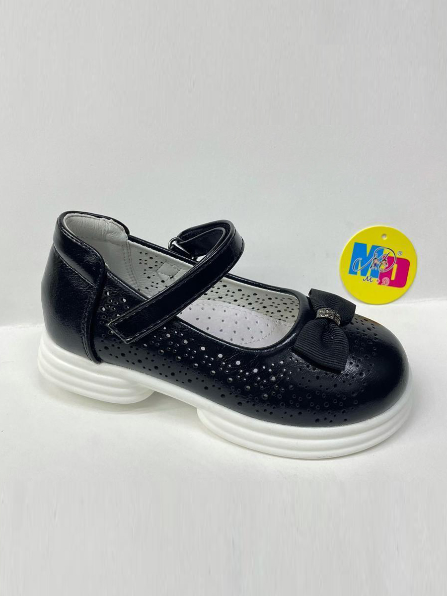 Туфли школьные для девочки с элегантным бантом, удобные и комфортные, черные с дышащей отделкой, фиксатор ремешок, контрастная белая подошва придает туфлям яркий дизайн.