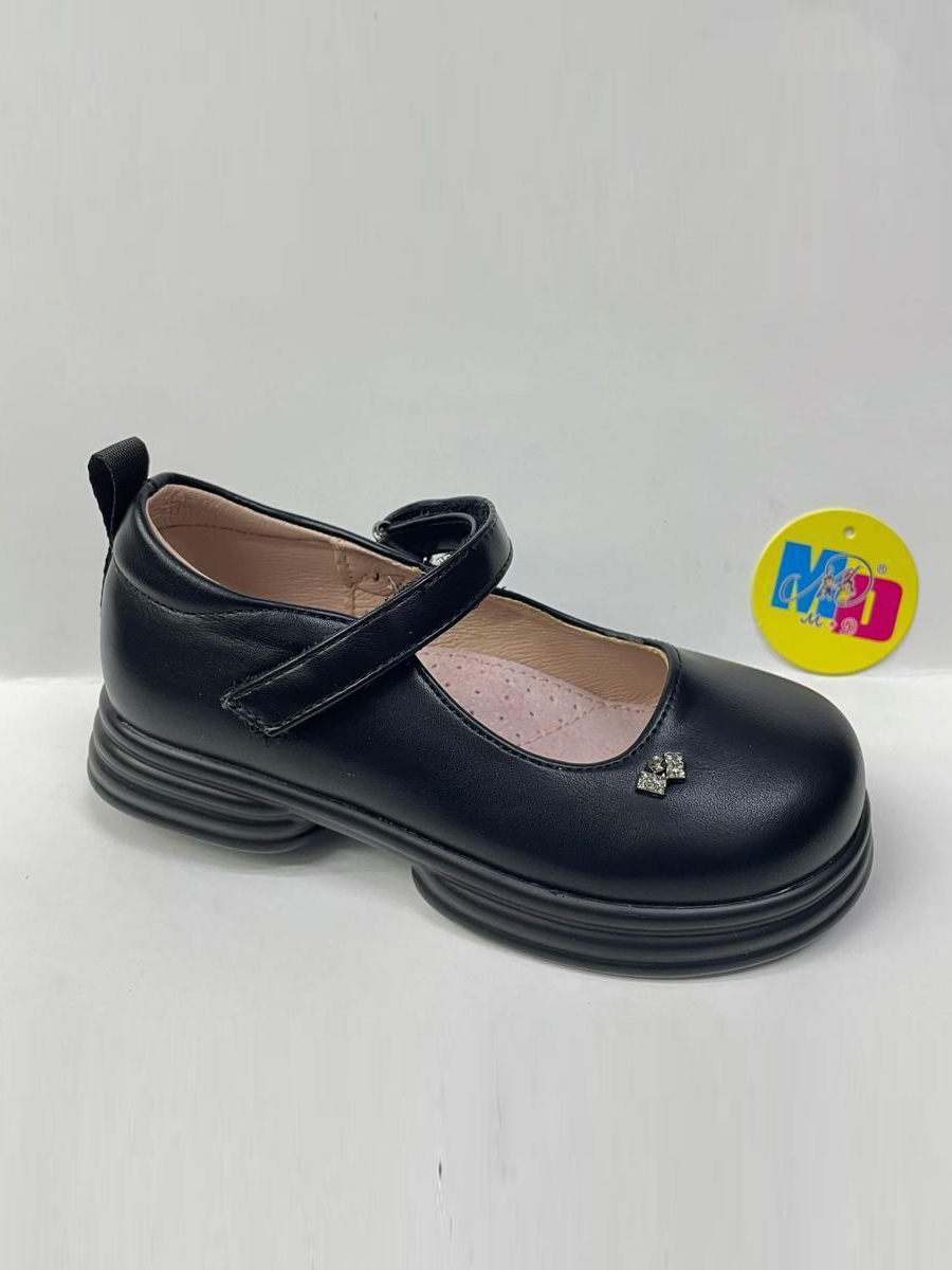 Школьные туфли для девочки черного цвета, ремешок-фиксатор, туфли дополняет кокетливый бантик из страз, создающий стильный и изящный образ, настроение и уверенность в себе.