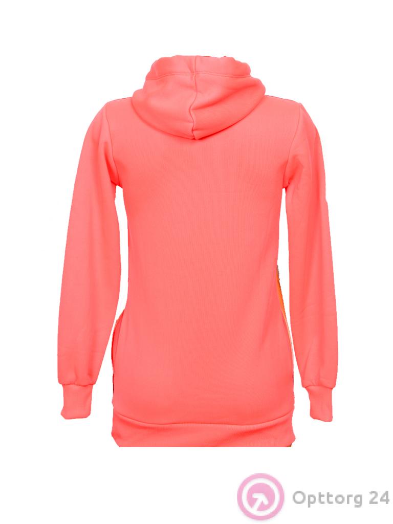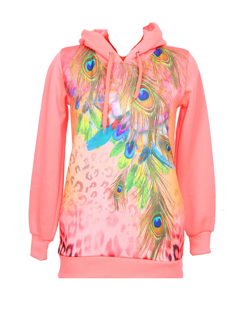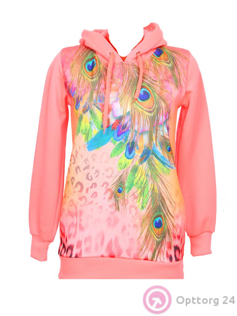 Женская толстовка розового цвета. Принт "перо павлина". Есть капюшон.