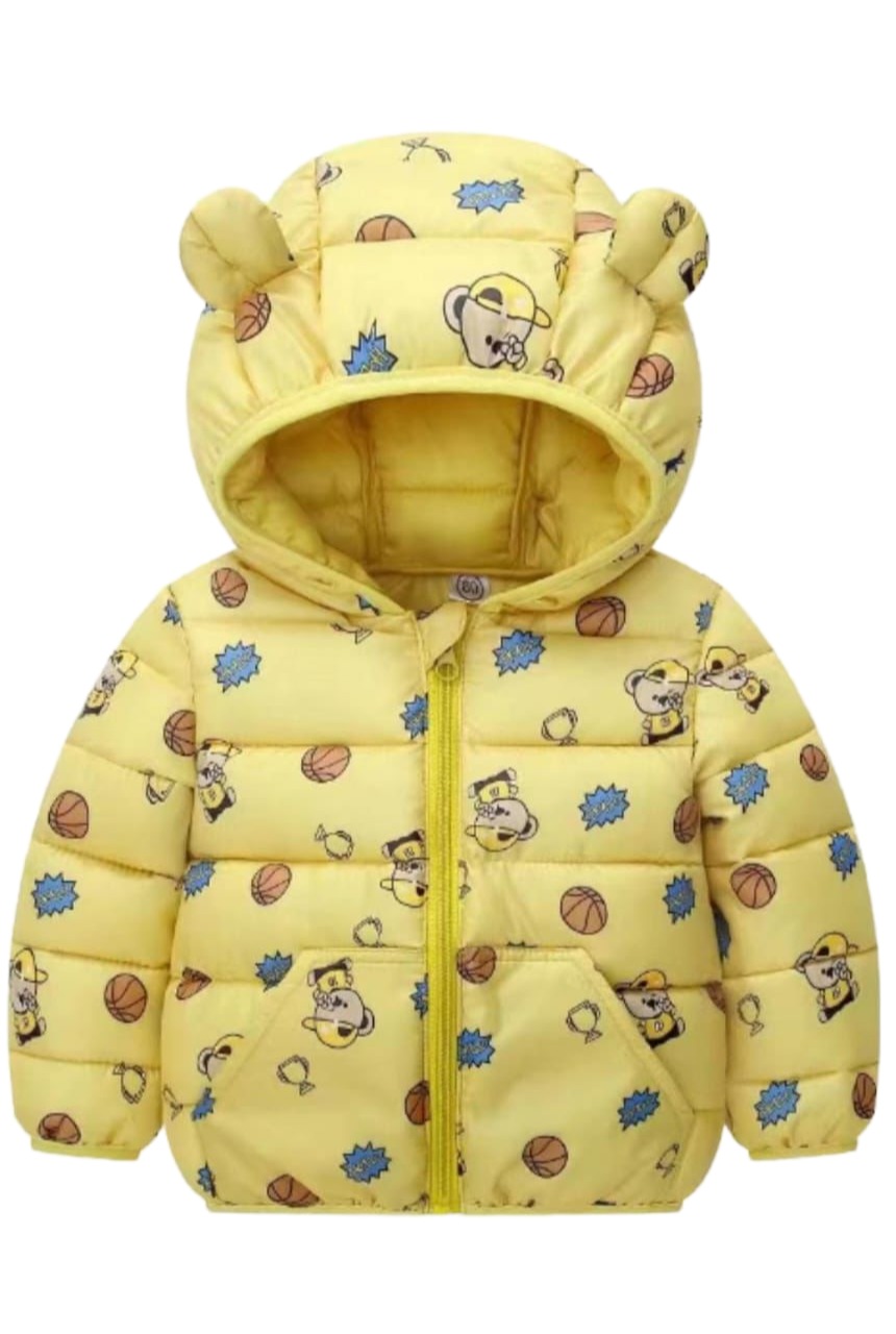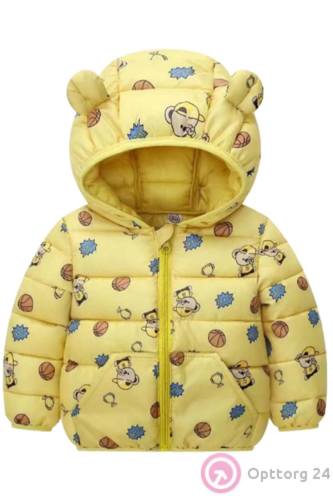 Куртка стеганая детская демисезонная с принтом. Застежка на молнии. Есть капюшон с ушками и два накладных кармана. Манжеты рукавов и низ куртки на резинке.