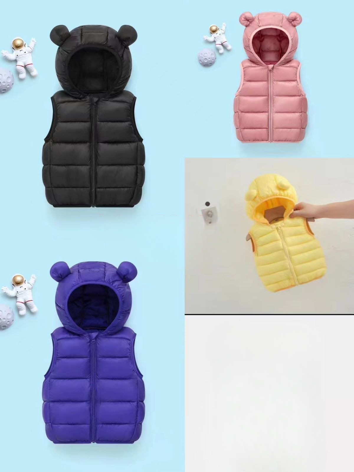 Жилет однотонный стеганый детский на синтепоне. Застежка на молнии. Есть капюшон с ушками. Низ жилета на резинке.