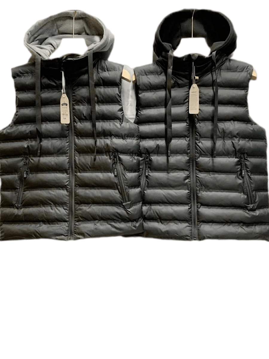 Жилет подростковый на синтепоне. Есть карманы по бокам. Капюшон выполнен из трикотажа и затягивается шнурком.