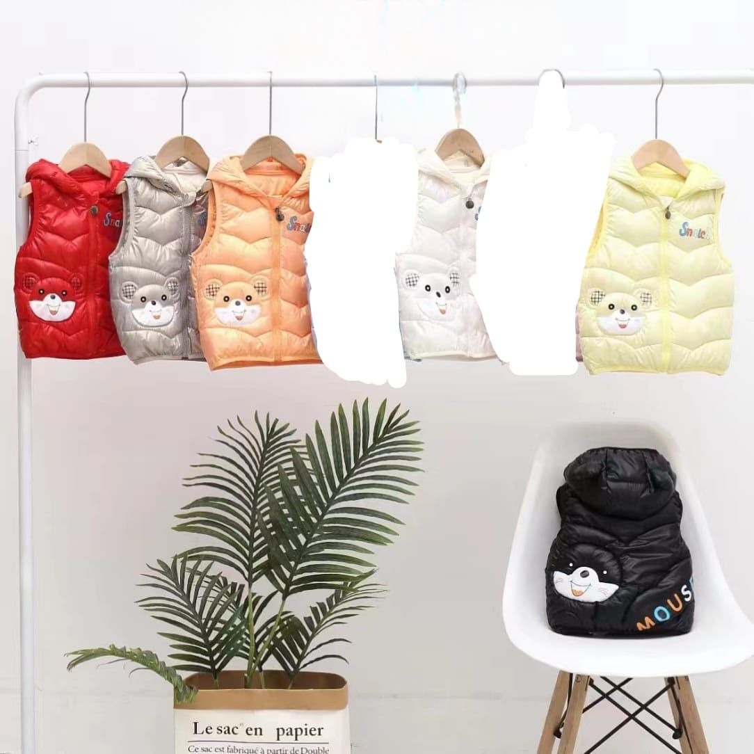 Жилет стеганый детский на синтепоне. Застежка на молнии. Есть капюшон. С декоративным элементом . Низ жилета на резинке.