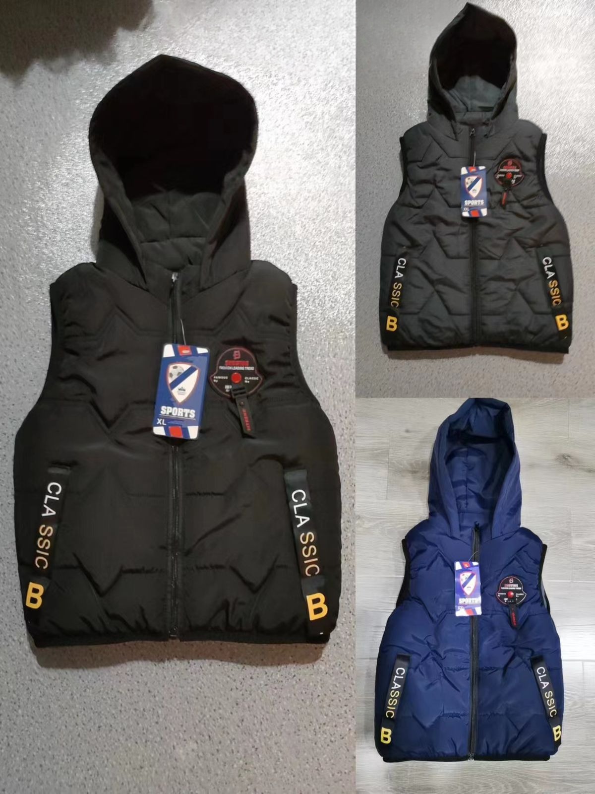 Жилет стеганый детский на синтепоне. Застежка на молнии. Есть капюшон и два кармана с надписью. Низ жилета на резинке.