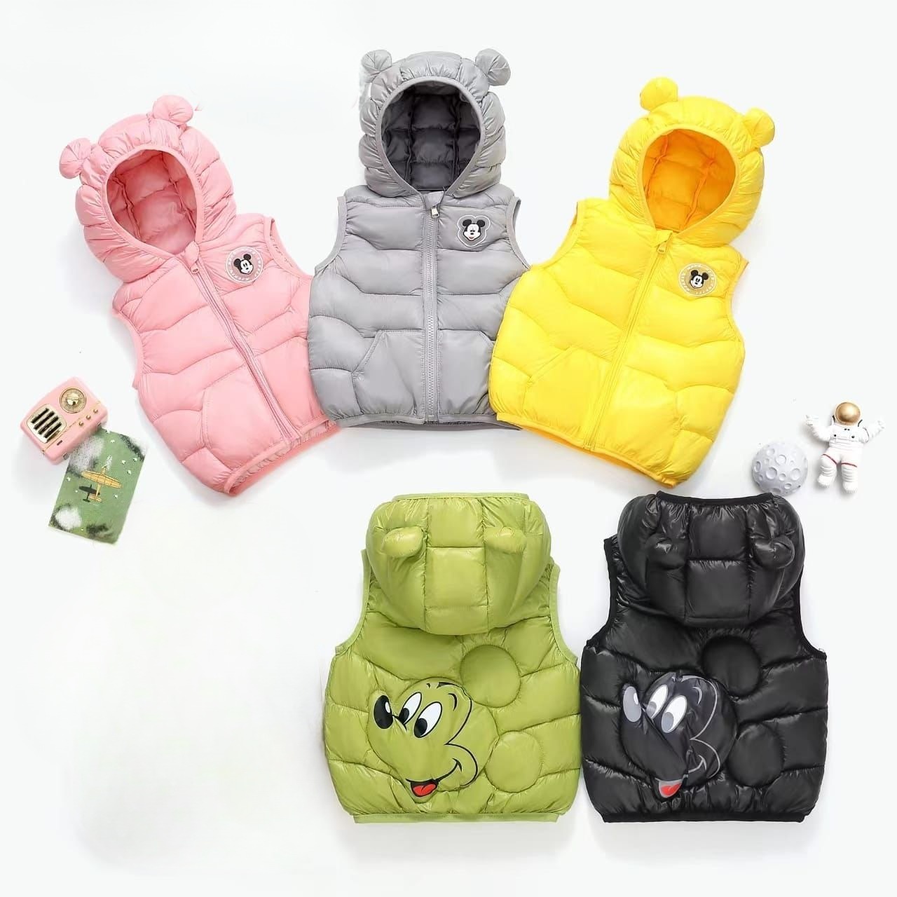 Жилет стеганый детский на синтепоне. Застежка на молнии. Есть капюшон с ушками и два накладных кармана. С рисунками. Низ жилета на резинке.