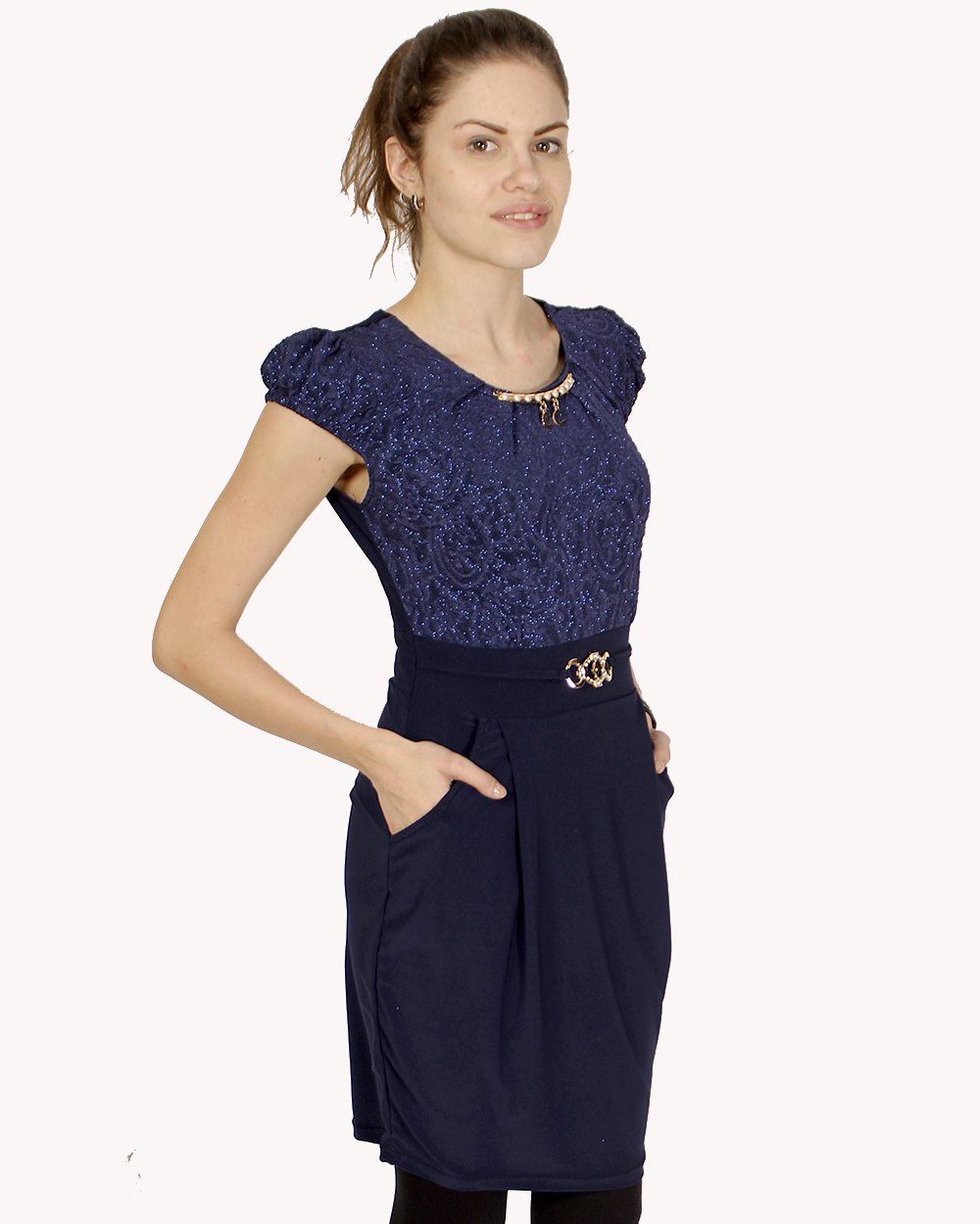 Женское стильное платье синего цвета, верхняя часть модели украшена блёстками. На изделии вшытый, вилюровый пояс в цвет платья.