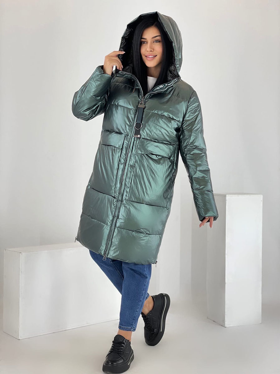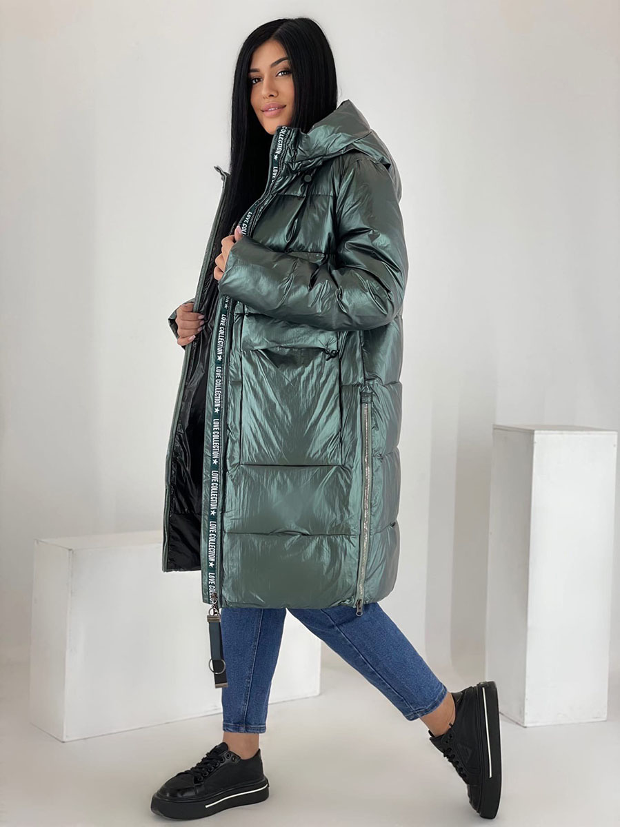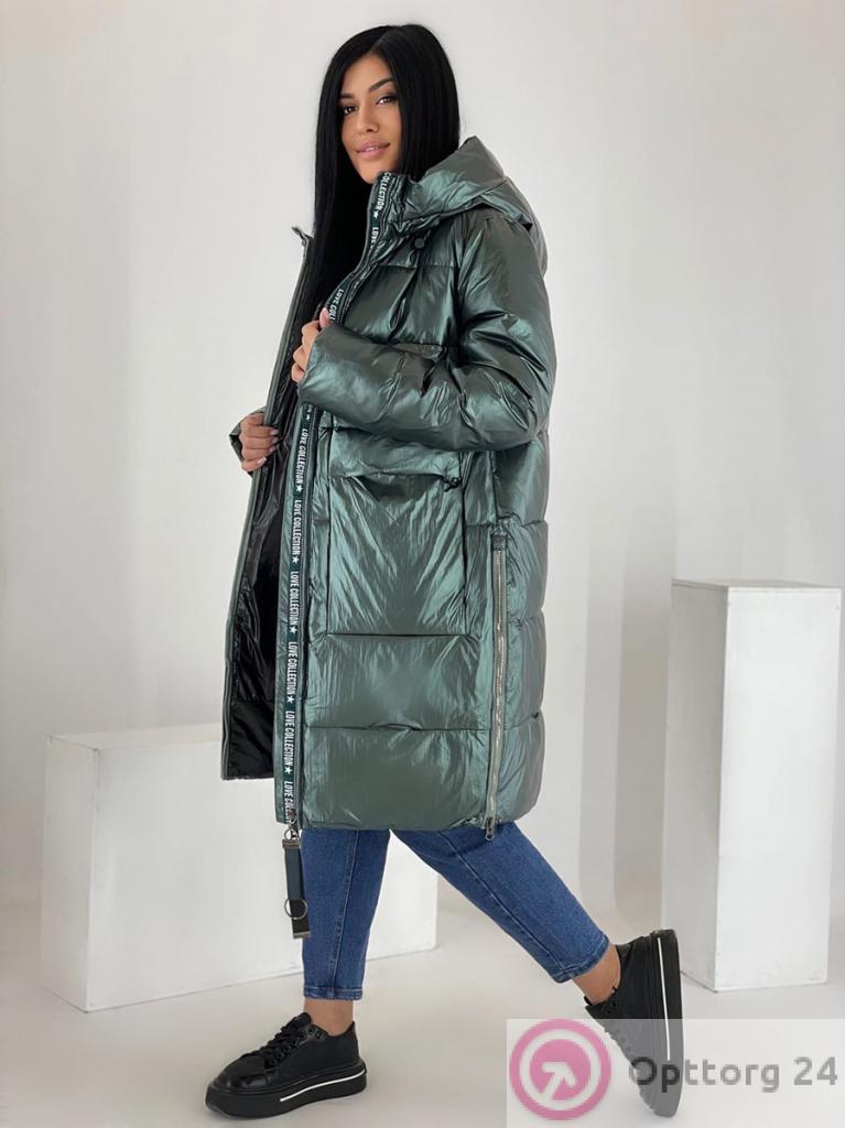 Описание: Пальто зимнее женское спортивного стиля, с металлическим отливом. Застежка на молнии, по бокам декорировано молниями. Есть два больших кармана и капюшон.